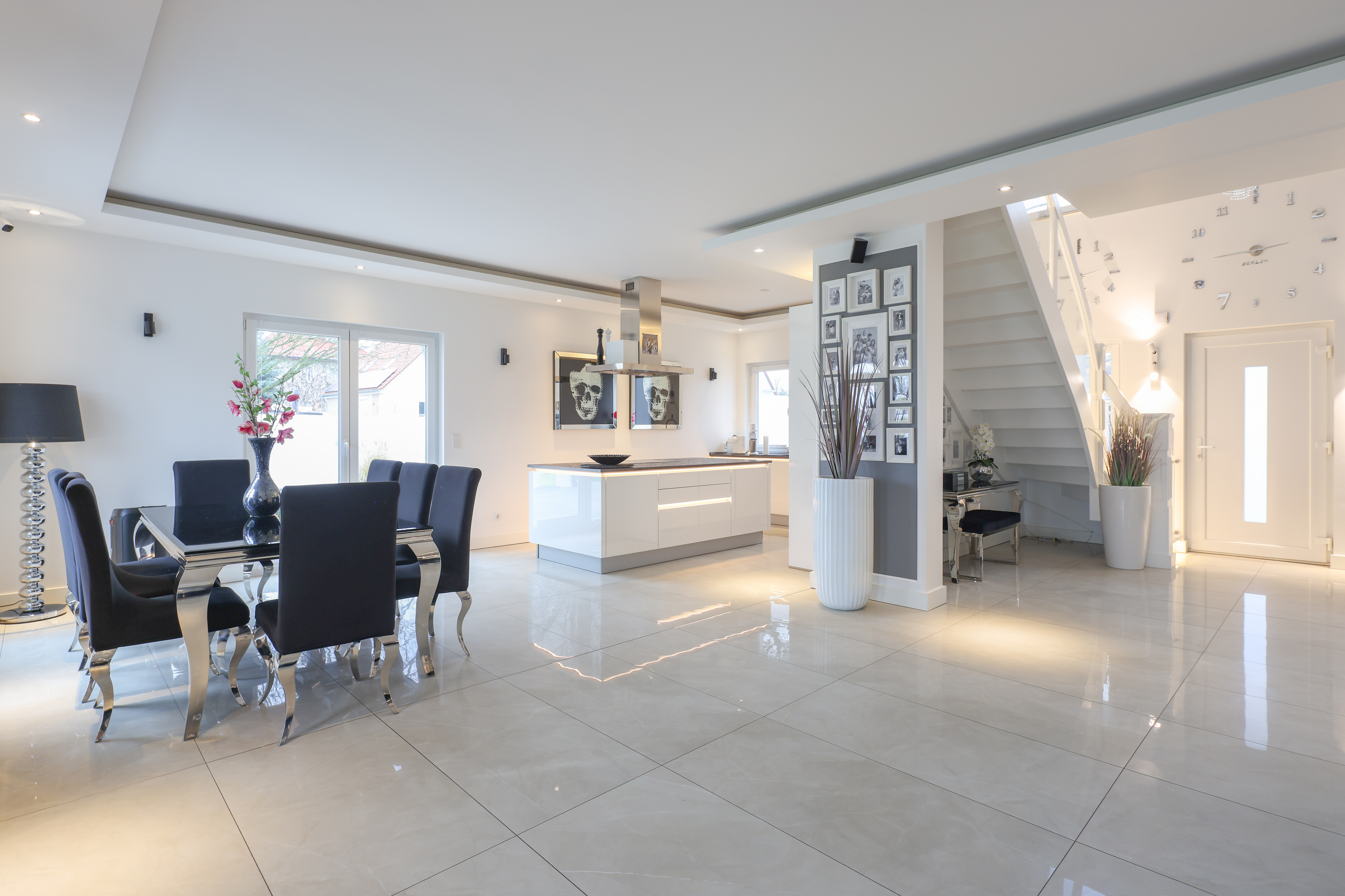 Der Wohn- & Essbereich bildet das Herzstück des Hauses – ein repräsentativer Ort für geselliges Miteinander und stilvolle Momente. Ein luxuriös gestaltetes Masterbad mit Walk-In-Dusche & Wanne und Doppelhandwaschbecken, ein Gäste-WC, eine Doppelgarage mit Extraraum sowie ein Gartenhaus mit eigenem Bad setzen Akzente in Premiumfunktionalität.